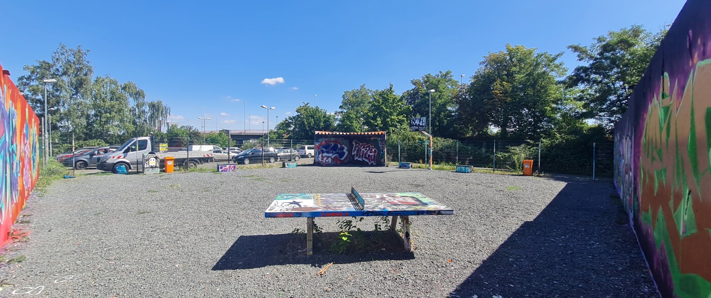 Auf dem Platz gibt es eine Tischtennisplatte, einen Basketballkorb und einen Unterstand.