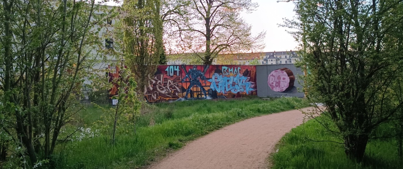 Die Projektwand befindet sich an der Zweinaundorfer Straße auf dem Gelände der ehemaligen Stadtgärtnerei nahe der S-Bahn-Haltestelle Anger-Crottendorf.